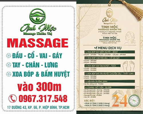 Tọa lạc tại 17 Đường 43, P. Hiệp Bình Chánh (nay là P. Hiệp Bình), TP. Thủ Đức, TP.HCM, Tịnh Mộc mang đến các dịch vụ massage trị liệu như massage đầu, massage cổ vai gáy, massage lưng, massage tay chân và bấm huyệt giúp thư giãn cơ thể và giảm đau nhức hiệu quả.